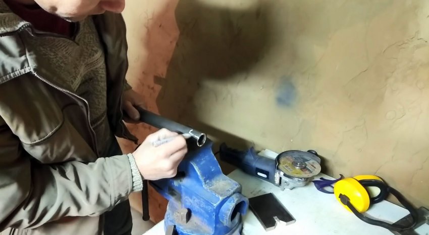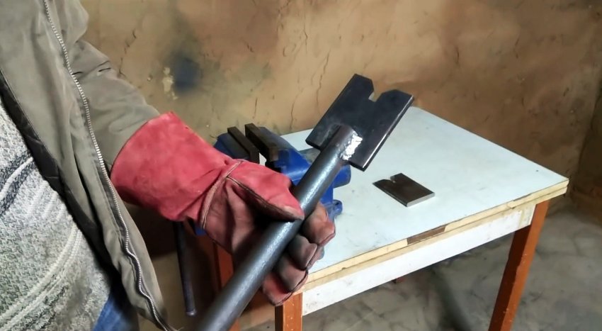 Второе лезвие необходимо снабдить рычагом. Для этого в конце отрезка трубы болгаркой производят пропил, в который вставляют и приваривают другую заготовку ножа.
