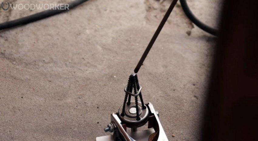 Далее нужно свести края саморезов, и сварить их между собой. Это делается очень легко, если запрессовать их в узкое отверстие в дощечке, и дополнительно дожать проволокой.