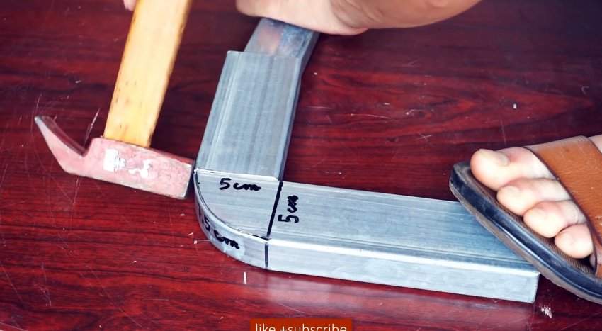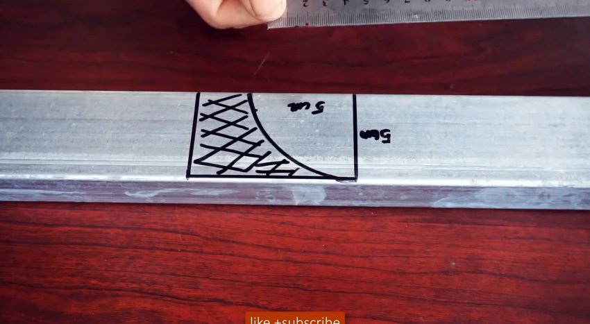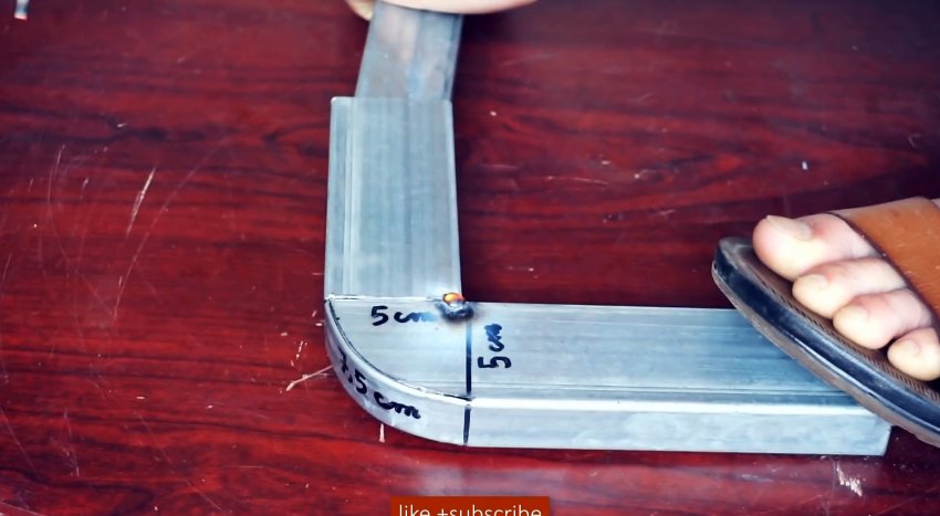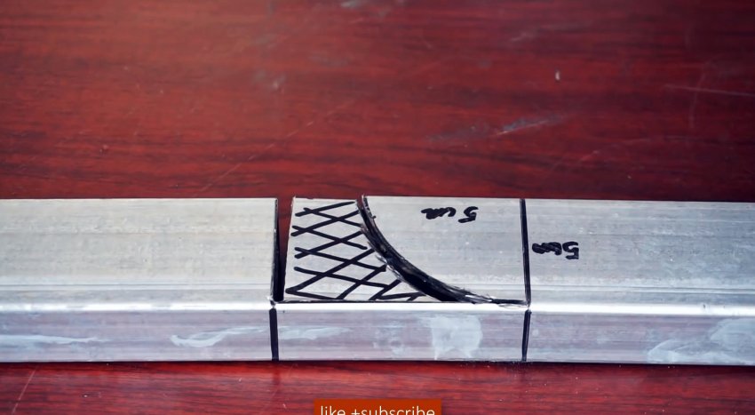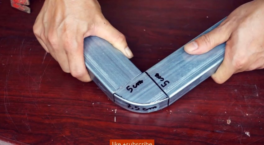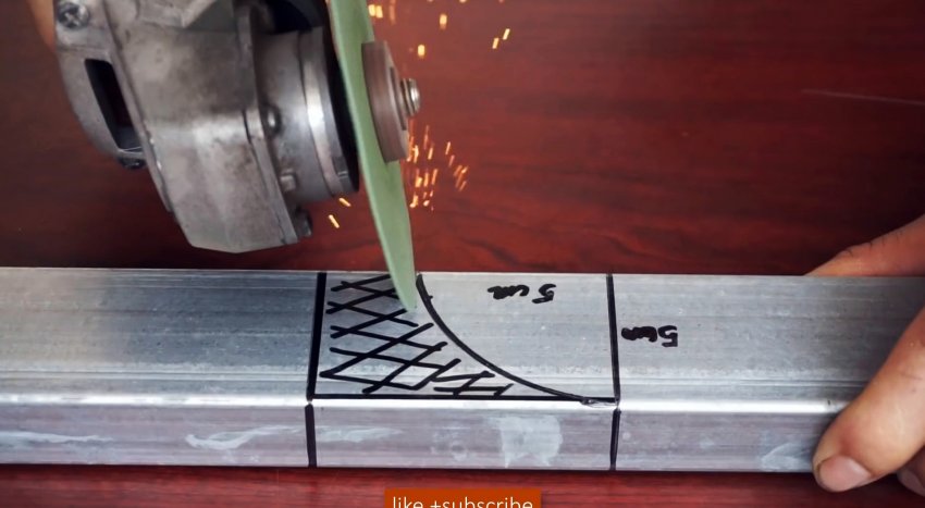 Скругленный угол формируется особым изгибом одной трубы, а не сваркой двух как стандартный прямой. Для этого на ней необходимо начертить поперечную линию с помощью угольника.