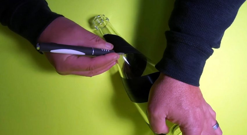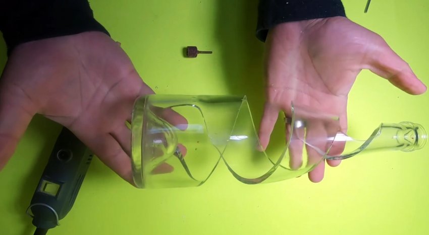 Когда спираль будет отделена от основной бутылки, ее нужно убрать. Для этого используется бормашина с алмазным отрезным диском. Спираль пилится поперек, а когда она треснет, нужно переместиться немного дальше и повторить рез. Так сегмент за сегментом можно полностью убрать лишнее.