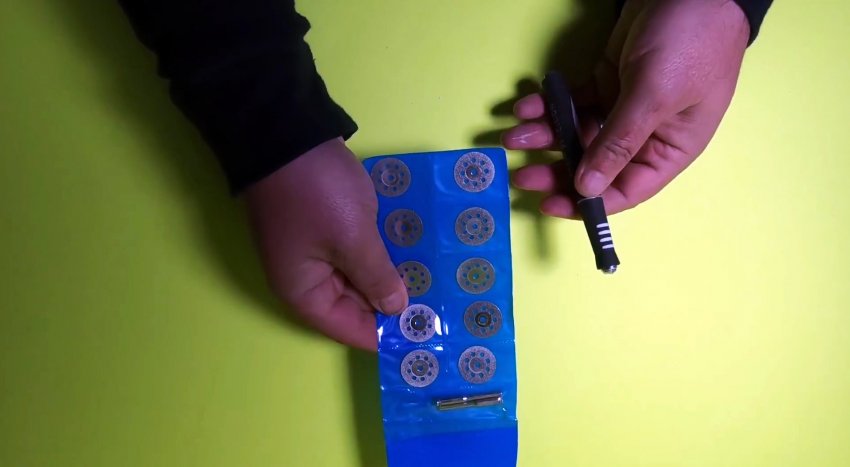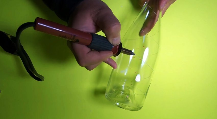Далее предстоит ответственный этап – необходимо процарапать контур спирали по краю изоленты. Пользоваться для этого обычным стеклорезом не совсем удобно. Вместо него лучше применять отрезной диск с алмазным напылением для бормашинки. Для этого тот зажимается в ручку скальпеля. Царапины им по бутылке получаются более глубокими.
