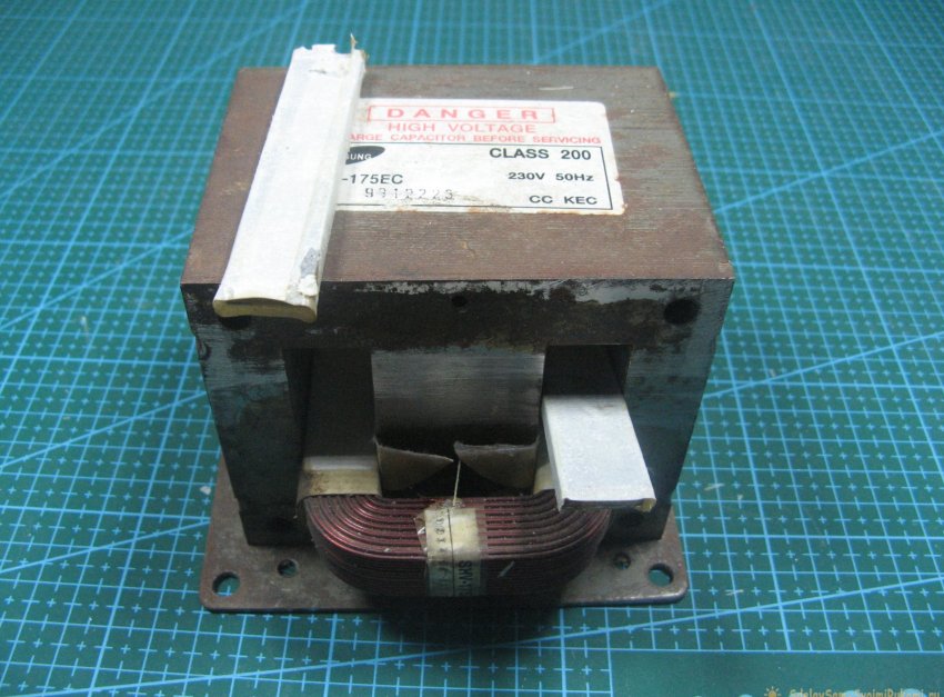 Первым этапом с трансформатора микроволновки снимаем вторичную высоковольтную обмотку, она намотана более тонким проводом. Спиливаем, и выбиваем остатки железным штырем. У меня обмотка медная, в последнее время попадается алюминиевая.