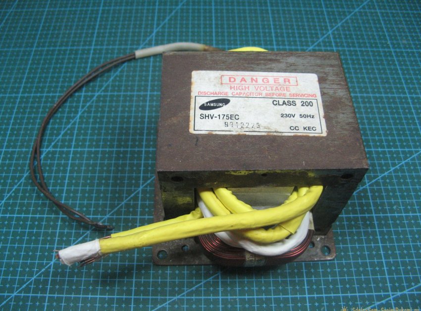 Трансформатор из микроволновой печи. Подойдет любой, они практически одинаковые. Мне попадались от 700-100 Ватт.