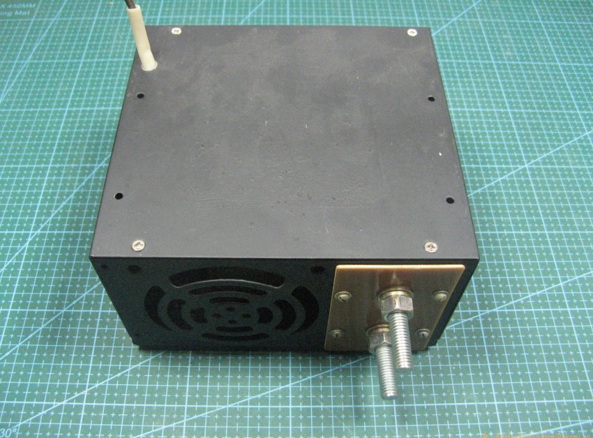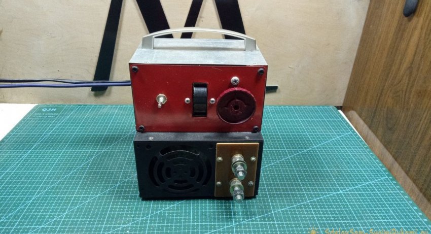 Трансформатор устанавливаю в пустой корпус от БП компьютера. На передней панели установил пластину из стеклотекстолита. В текстолите просверлил пару отверстий и с помощью 2-х болтов на 8 мм закрепил концы обмоток.