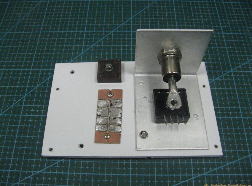 Тиристор и диодный мост креплю на общую пластину. Диодный мост изолирован от своего корпуса. Рядом с ними прикручиваю маломощный диодный мост. Так же делаю пластинку для установки на нее конденсаторов. Конденсаторы нужно подбирать. У меня в итоге получились на: 470, 1000, 2200 мкф.