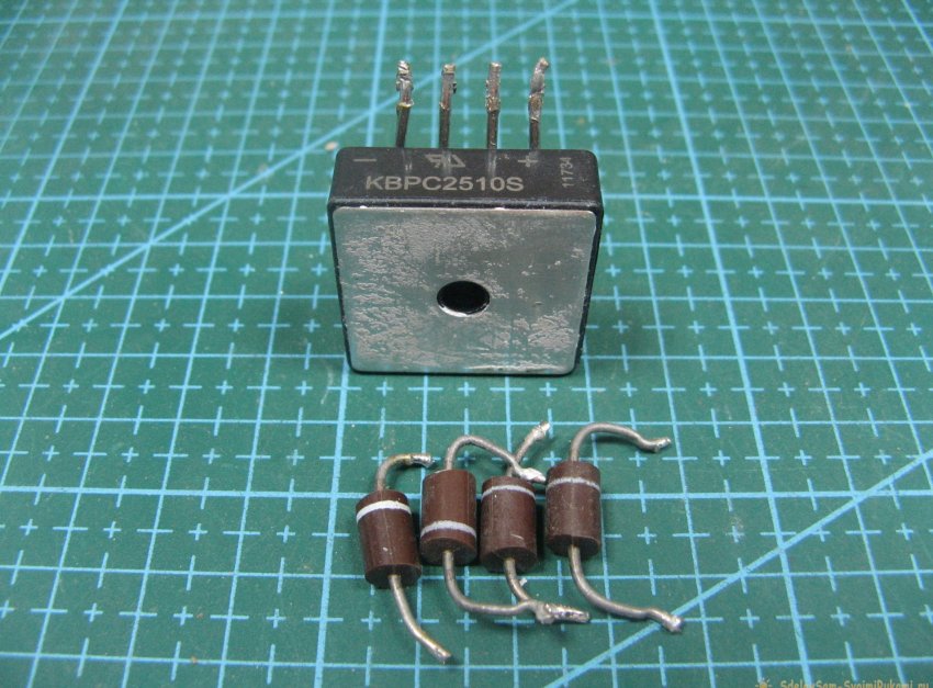 Мощный диодный мост и маломощный. Мощный мост, чем мощней, тем лучше. У меня на 25 Ампер, 1000 Вольт. Маломощный мост, любой готовый или можно собрать из четырех диодов.