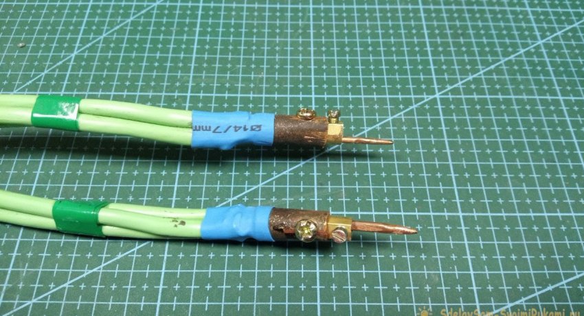 Выходные кабеля сделал из 2-х проводов по 6 кв.мм каждый. Электроды делаю из медного провода 6 кв.мм. Нагревается все не сильно, т.к. обычно точек сварки за раз делается не много.