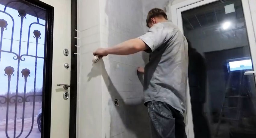 После создания фактуры следует сорвать скотч под клеем. Затем штукатурится следующий участок. Желательно успевать делать 1 стену за день, так как в противном случае будут проблемы со срывом малярной ленты.
