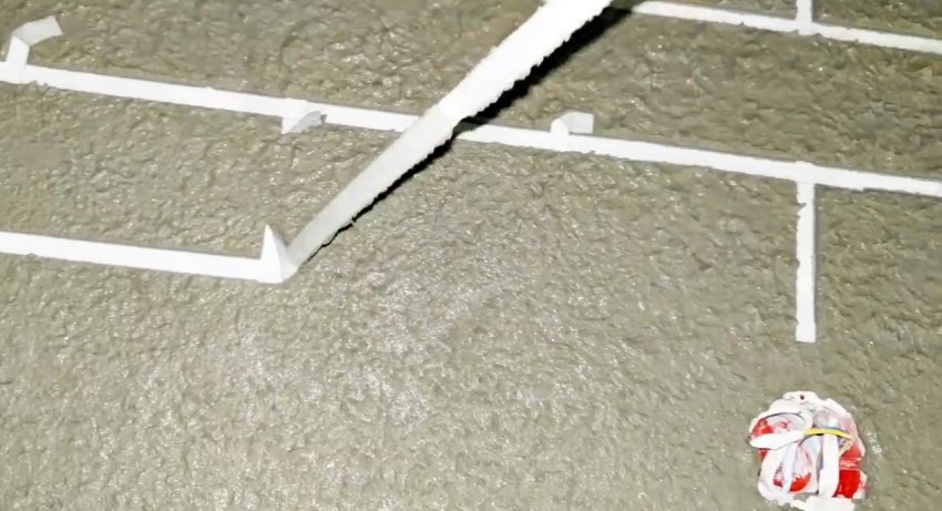 Лентой заклеиваются горизонтальные линии. Если стена хорошо прогрунтована, то он липнет хорошо. Затем приклеиваются вертикальные линии, учитывая шаг кладки, чтобы швы получились в шахматном порядке.