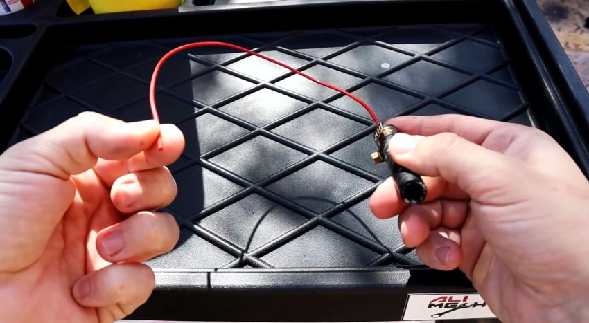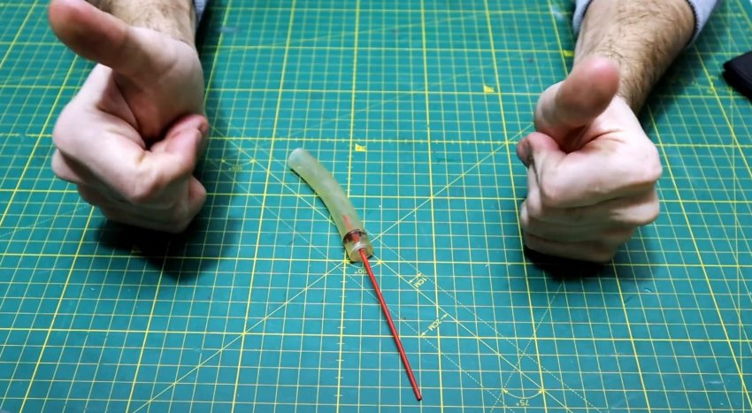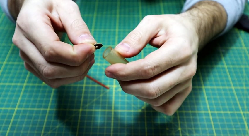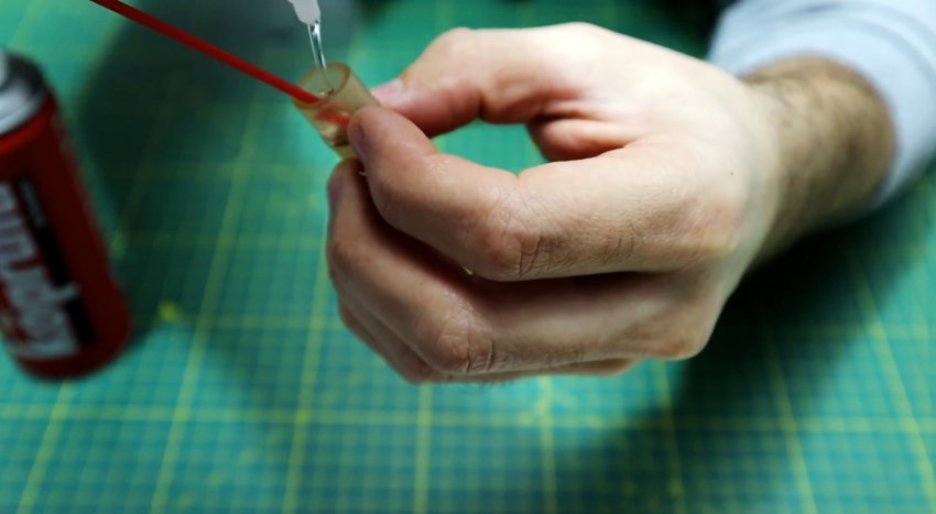 Теперь нужно сделать адаптер, чтобы обеспечить подачу на форсунки жидкости для прочистки карбюратора. Для этого подбирается тонкий шланг, и в него вклеивается трубочка с баллончика от очистителя.