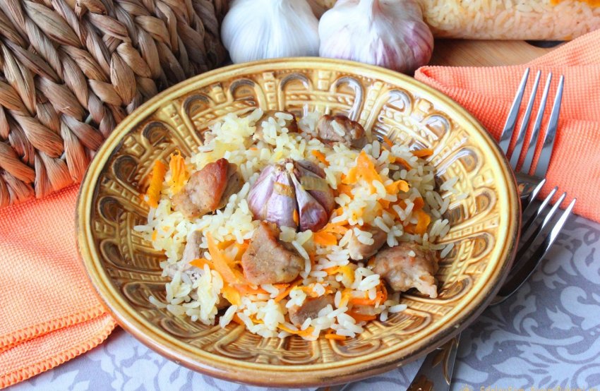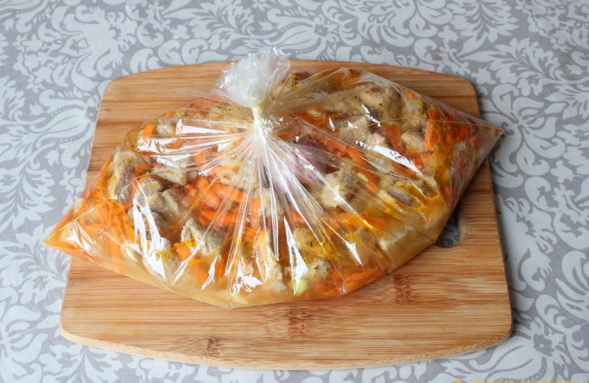 Плов – это универсальное блюдо, которое мы готовим регулярно. Я готовила плов в казане, в кастрюле, в сотейнике, в мультиварке. Хотя правильнее всего, конечно, делать его в казане. В каждом из перечисленных выше способов приготовления есть свои плюсы и минусы. Но недавно я наткнулась на очень нестандартный способ приготовления плова – в пакете для запекания. Разумеется, сразу же опробовала данный рецепт. И знаете, это здорово. Мне очень понравился способ! Плов выходит очень вкусным, рассыпчатым, насыщенным, не сухим. Про такой плов говорят – рисинка к рисинке. К тому же, в данном случае у нас получается минимальное количество грязной посуды. Не нужно отмывать жирный казан. Готовый плов аккуратно перекладывается из пакета в кастрюльку, а сам пакет выкидывается. А вообще можно оставить и в пакете! Кстати, если уж совсем хочется сэкономить время на приготовление, можно не делать предварительную обжарку. Все прекрасно запечётся в пакете. Я называю этот плов «Ленивый». Очень рекомендую этот рецепт!