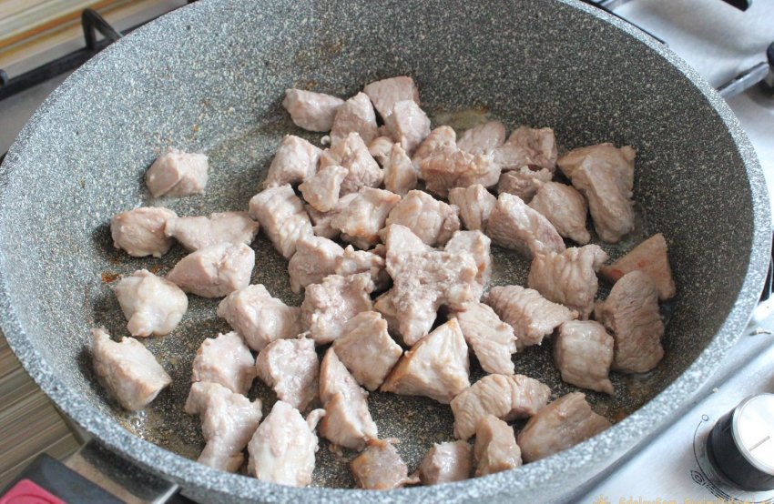 Для приготовления плова я беру простой пакетик для запекания с фиксатором. В удобную сковородку вливаю растительное масло. Прогреваю. Кладу свиной окорок, нарезав его произвольными кусочками. Поджариваю до чуть золотистой корочки (около 2-3 минут) на сильном огне.