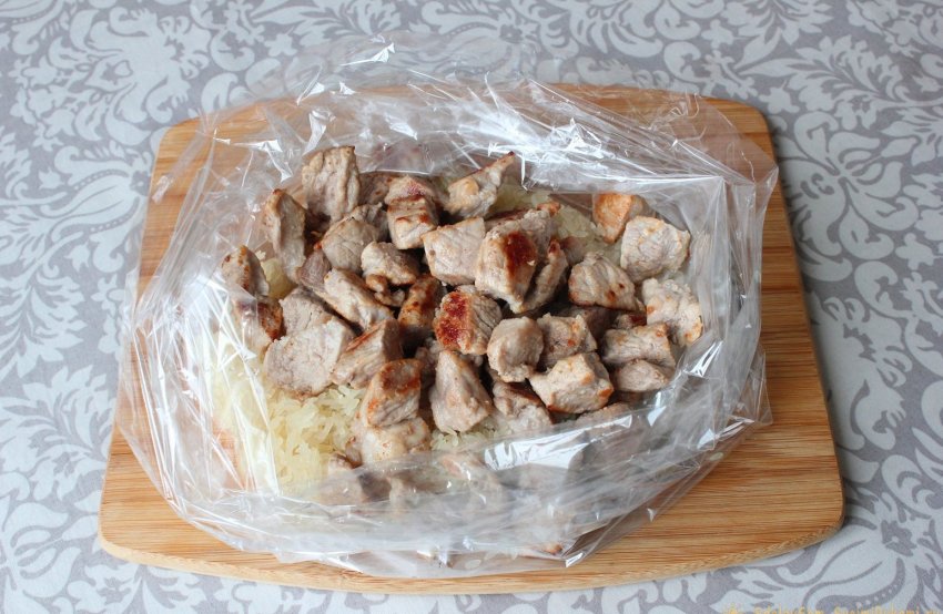 Обжаренные кусочки мяса закидываю в пакет для запекания поверх риса.