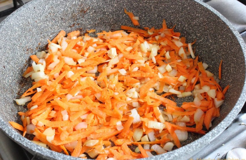 В сковороде на этом же масле обжариваю тертую морковь и измельчённый лук (пару минут).