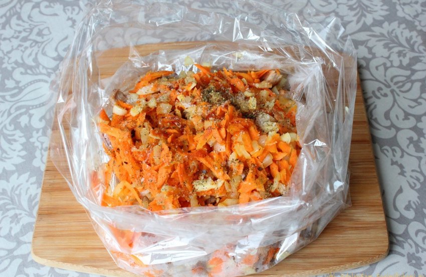 Перекладываю обжаренные овощи в пакет. Добавляю все приготовленные специи.
