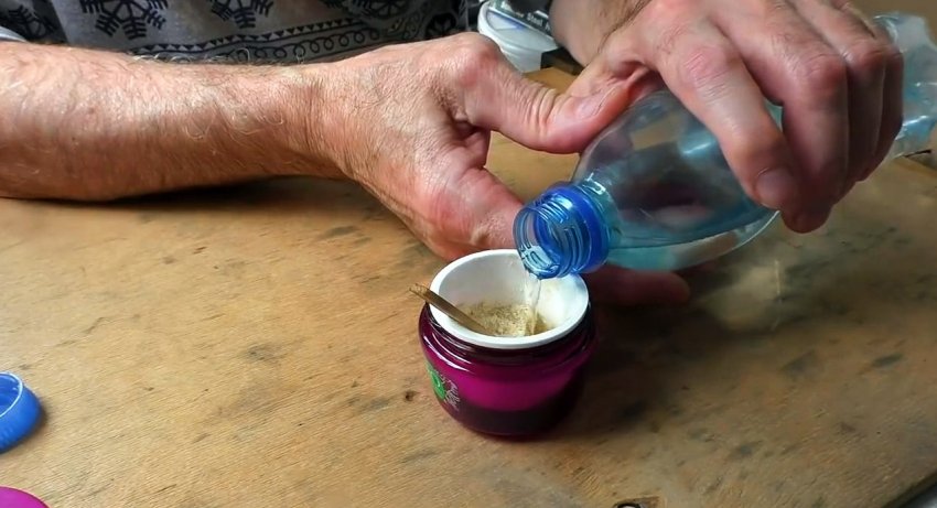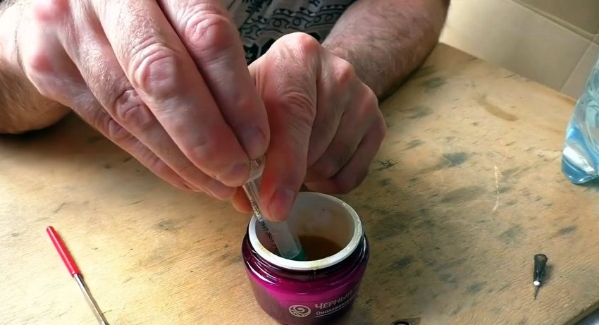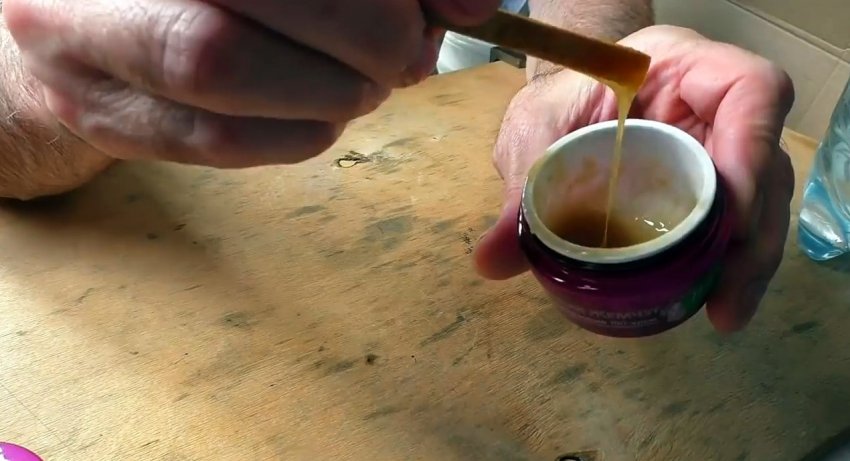 Порошок пересыпается в баночку, и в него подливается растворитель бензин Б-70. Лить нужно понемногу, чтобы флюс получился консистенции геля, а не жидкостью. Состав необходимо перемешать 5-10 мин до полного растворения порошка.