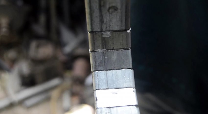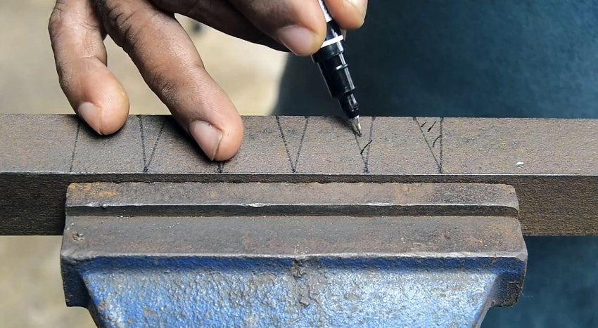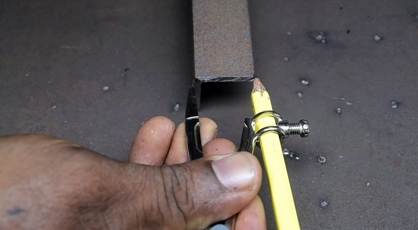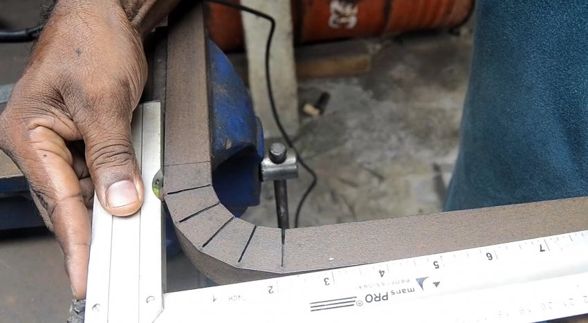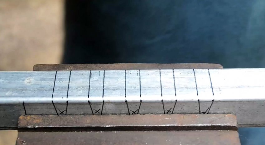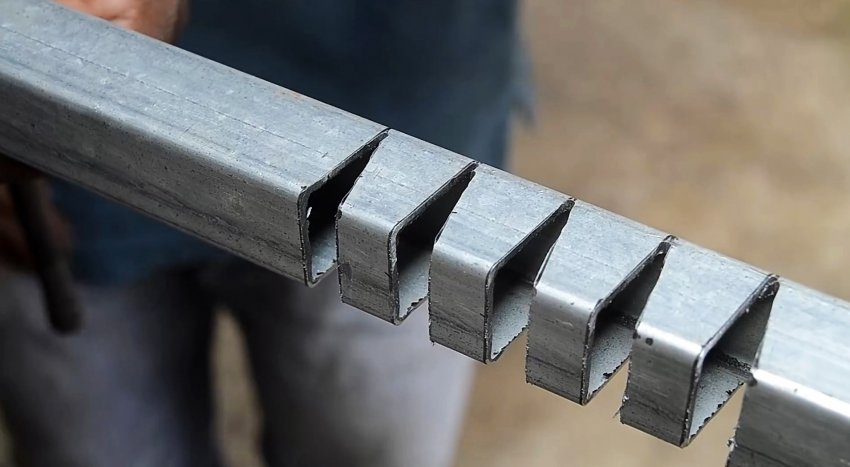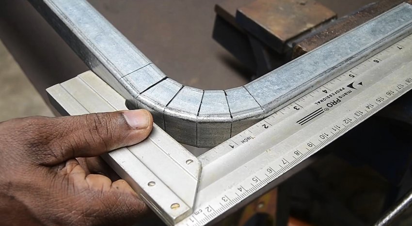Аналогично можно сгибать и профильную трубу. Разница только в том, что клинышки для выреза нужно начертить и на противоположной стенке.