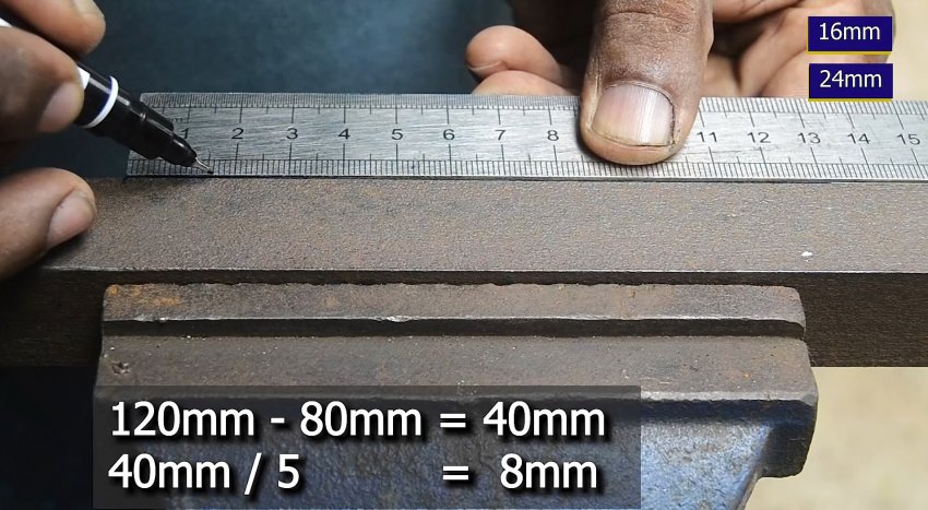 Теперь выполняется расчет меток. Для этого от первоначальной длины окружности 120 мм отнимается полученная после обрезки 80 мм. Итоговая разница разделяется на 5. В конкретном случае 40/5=8 мм. Это и есть шаг установки метки.