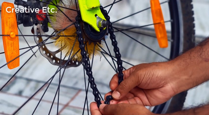 Затем между звездочками натягивается цепь. Чтобы иметь возможность регулировать ее натяжение, на пластине вместо отверстий должны быть проточки.