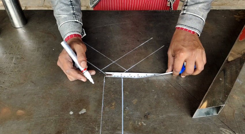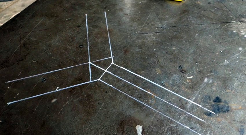 После этого нужно начертить схему расположения труб на этой поверхности в реальном размере. Для этого используется линейка, или же профильная труба аналогичного сечения со свариваемой.