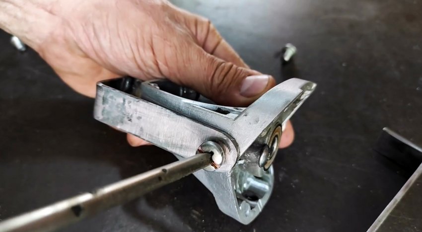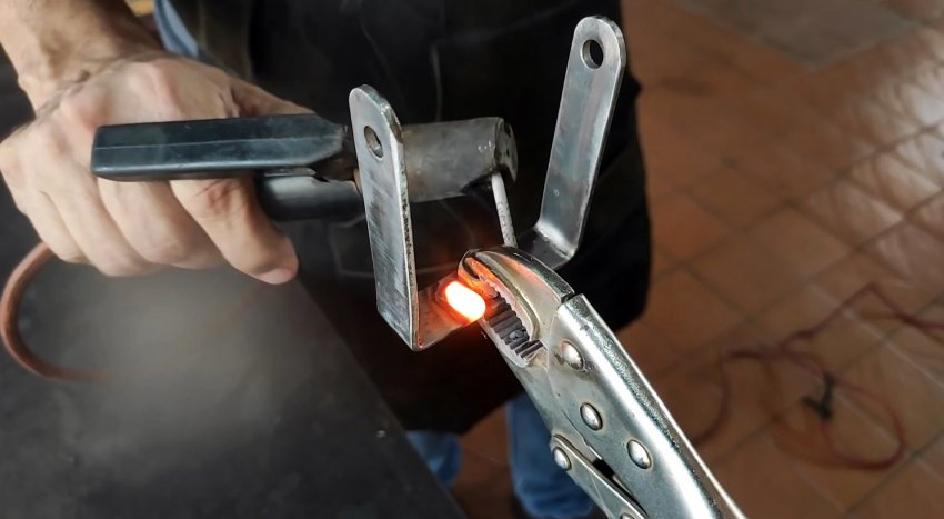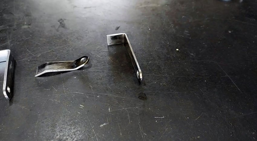 На следующем этапе изготавливается из полосы задняя П-образная скоба для крепления упора дрели. С краев в ней делают отверстия, чтобы прикрутить ее к редуктору в штатные отверстия для съемной рукояти. Также скоба просверливается в центре. К этому отверстию приваривается гайка М8-М10, чтобы вкручивать ручку с болгарки. Затем она прикручивается к редуктору. Для увеличения жесткости из полосы выгибается еще Г-образная заготовка. Ее нужно будет прикрутить к третьему отверстию на редукторе и сварить со скобой.
