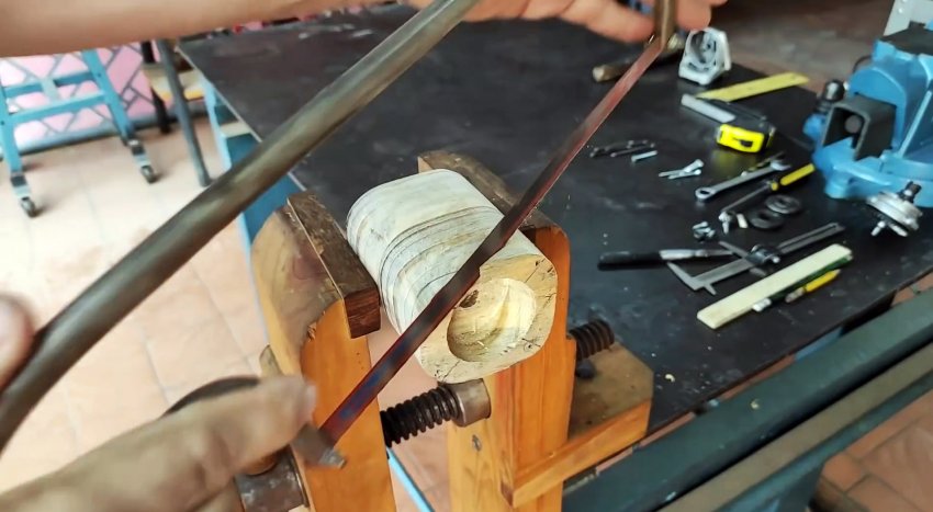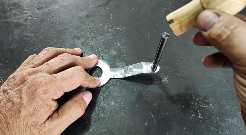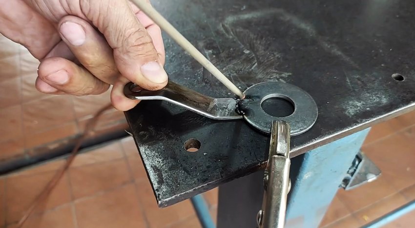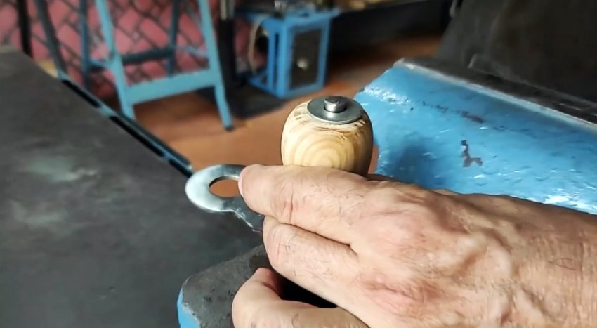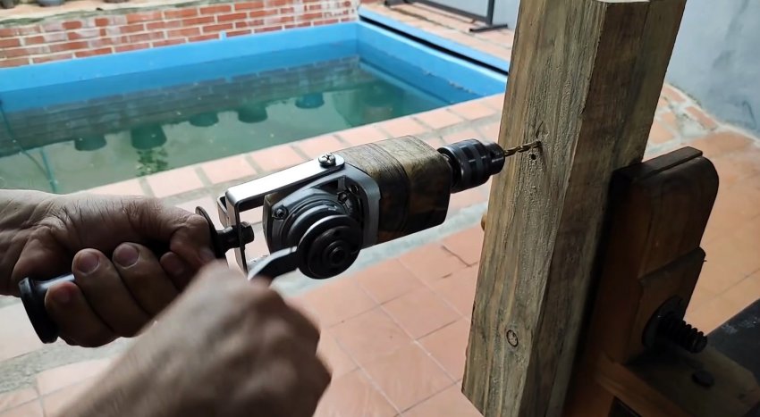 Чтобы вращать дрель, понадобится самодельная ручка. Ее можно сделать, сварив гайку М14 с отрезком полосы, подогнутым для удобства. На краю полученного рычага приваривается штырь, на который насаживается деревянная ручка, затем он заклепывается, чтобы та не слетала.