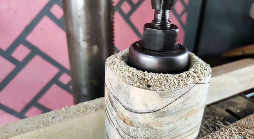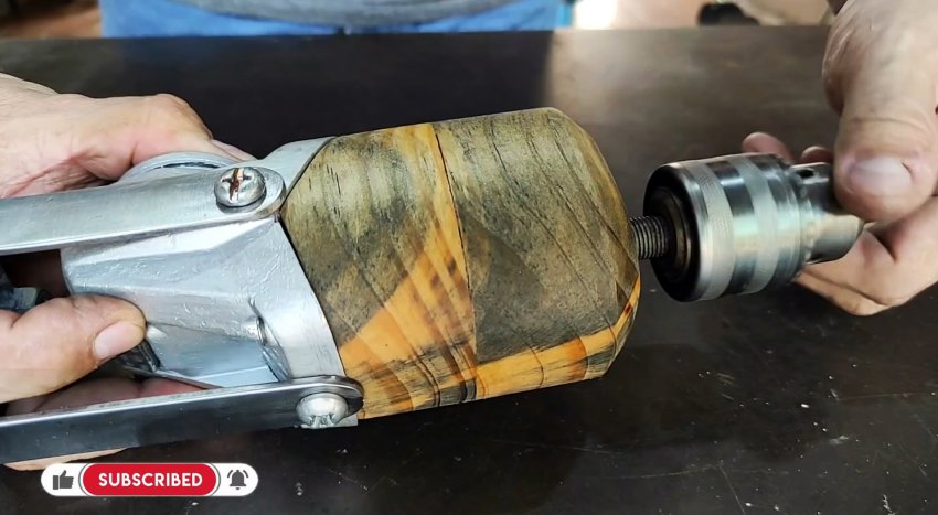 Далее предстоит изготовить деревянный корпус дрели. Для этого используется отрезок бруса. Нужно просверлить его по центру под сваренный вал. После этого он обрезается и строгается под размер редуктора.