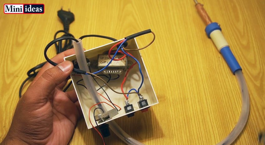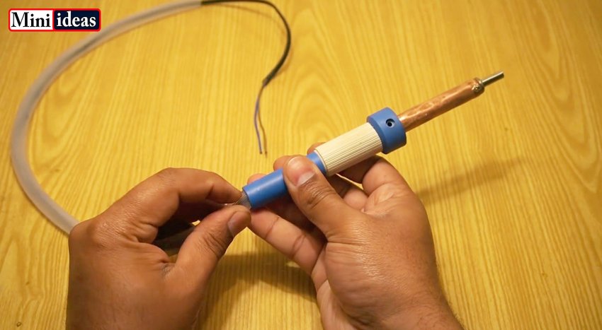 Провод питания без вилки пропускается через ПВХ или силиконовую трубку. Ее край нужно плотно вставить в ручку паяльника и подклеить.