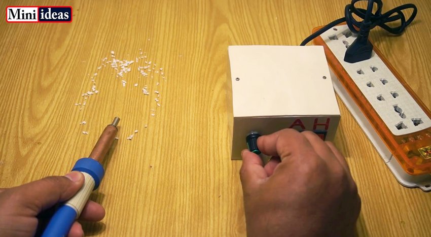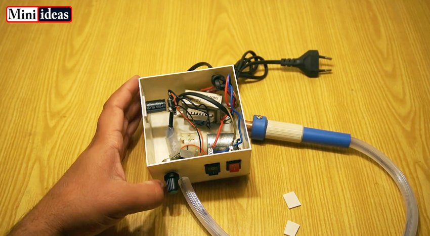 После сбора компонентов нужно закрыть корпус крышкой. Таким образом, термофен будет иметь 2 выключателя, отдельно на нагрев и компрессор. Регулятором оборотов можно менять силу потока воздуха, настраивая устройство под те или иные условия пайки.
