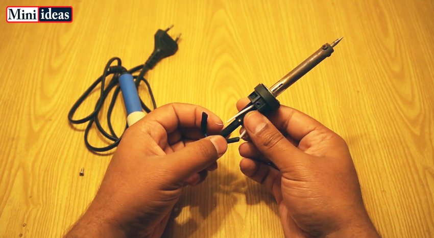 Необходимо разобрать паяльник, и отсоединить провод питания.