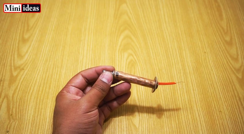 Вместо штатного жала устанавливается тонкая трубка, спиленная из телескопической антенны. Затем к спирали подсоединяется провод питания со снятой вилкой. Его нужно пропустить в ручку, и затем приклеить шайбу на медной трубке к самому фартуку.