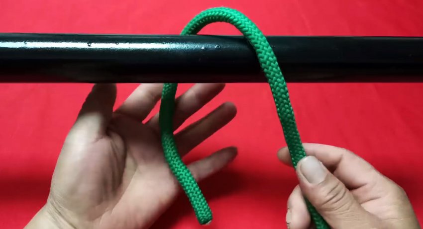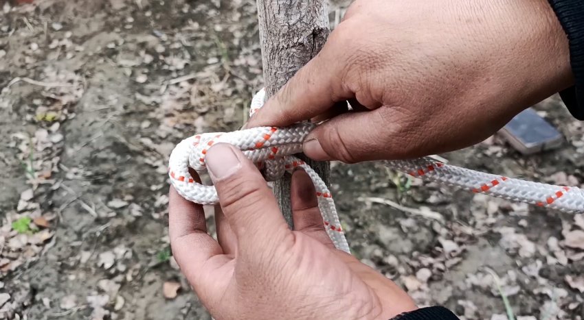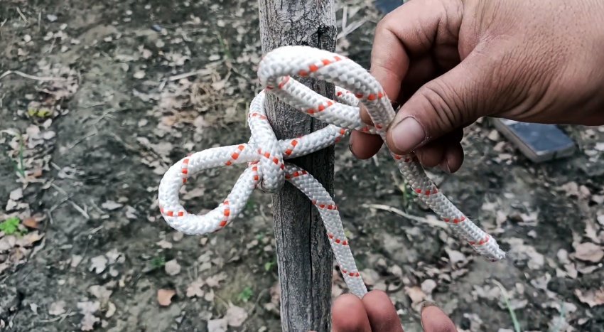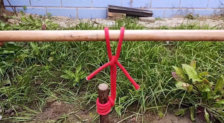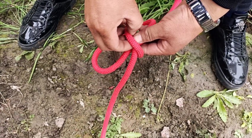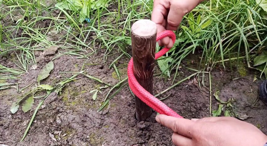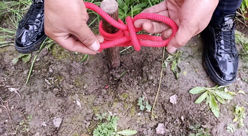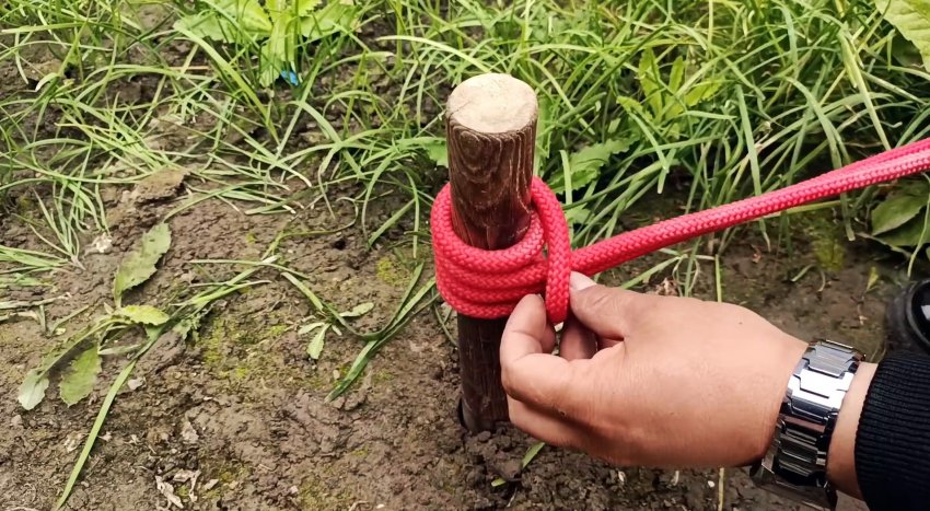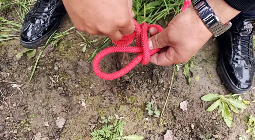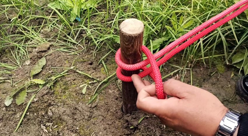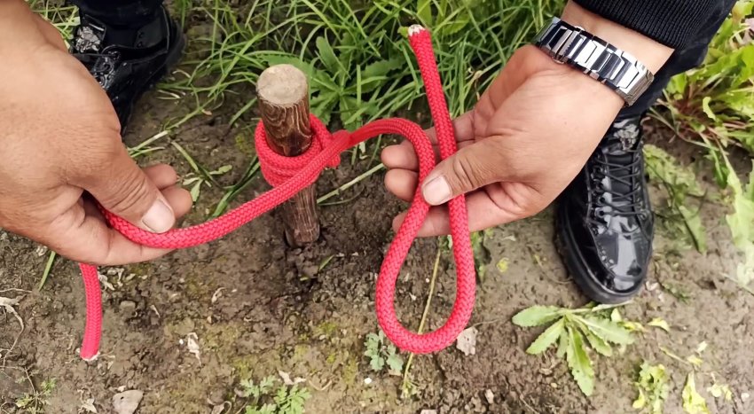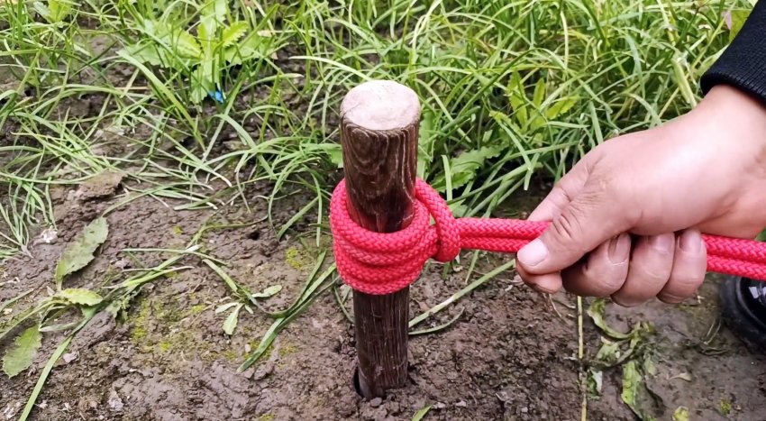 Веревка складывается пополам. Ее петля обводится вокруг столба или вбитого кола, который нужно вырвать из земли. Через нее пропускаются сложенные концы 2 раза, после чего она затягивается.