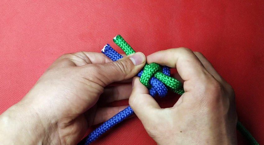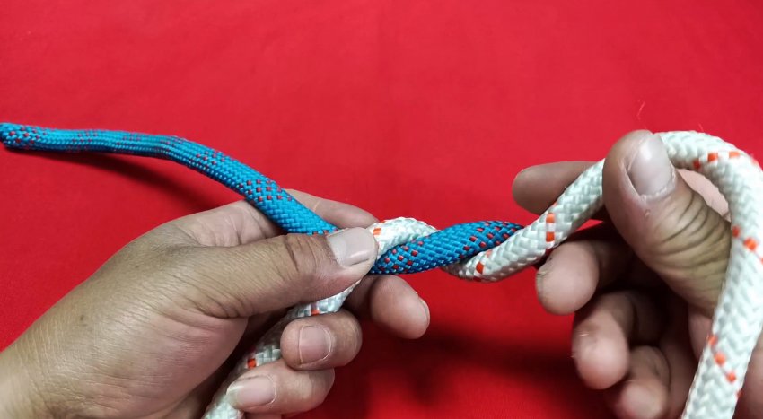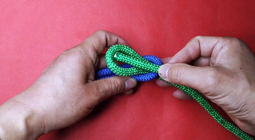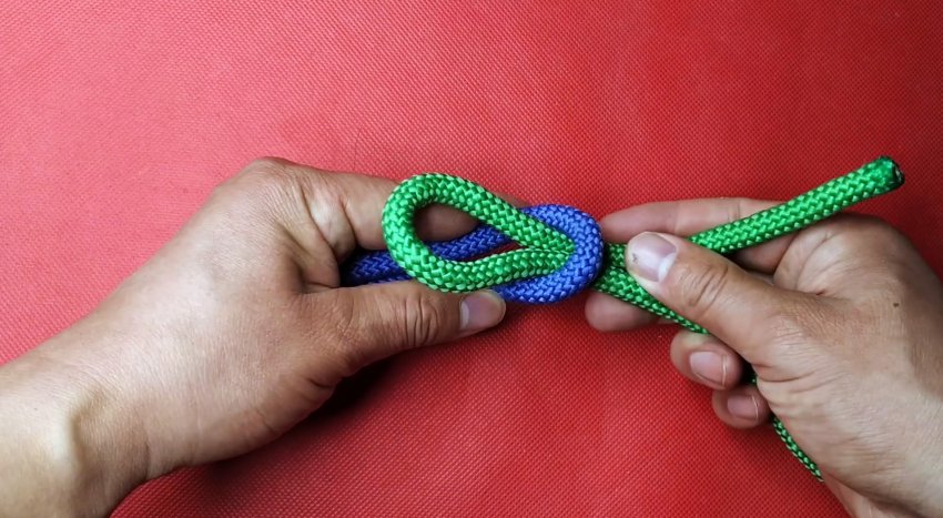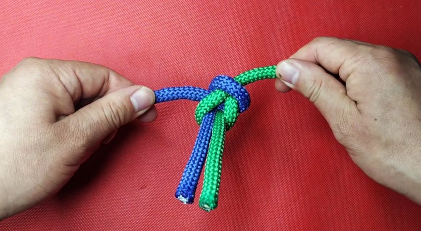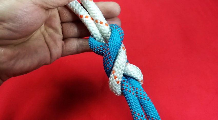 После этого короткие края нужно просто завязать в простой узел. Потянув за длинные концы можно окончательно затянуть веревки, закончив сращивание. Под нагрузкой такой узел не уплотнится сильно, поэтому его можно будет развязать.
