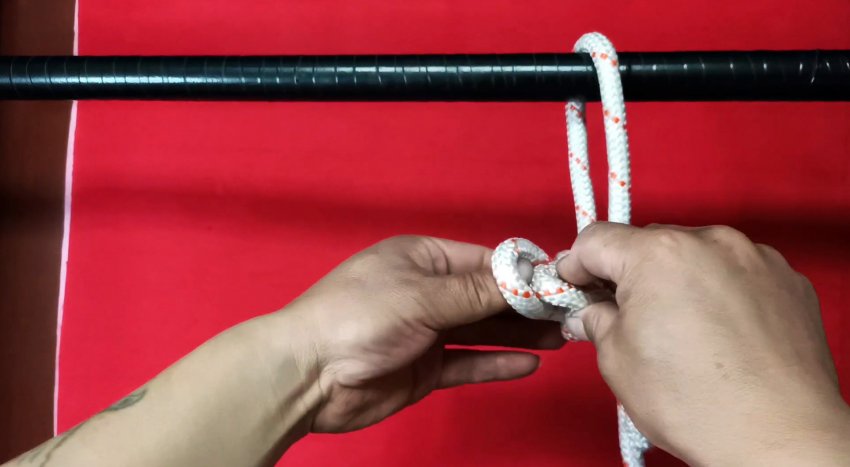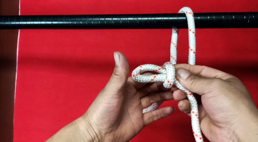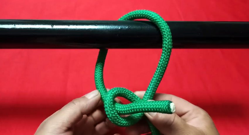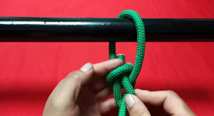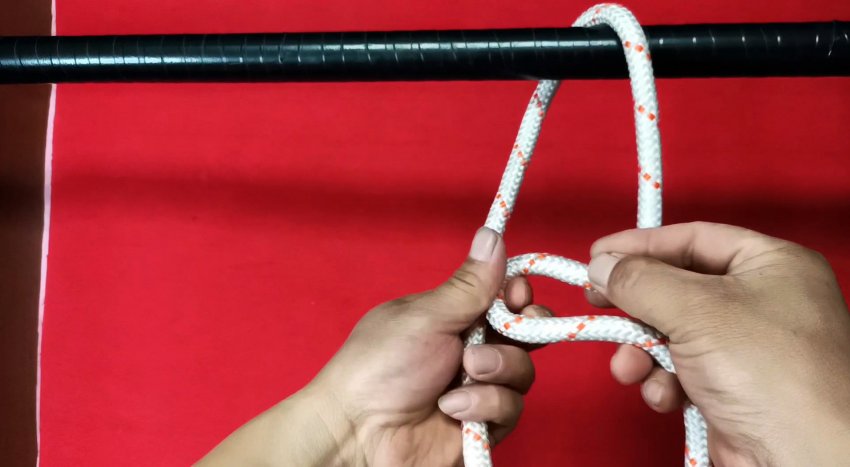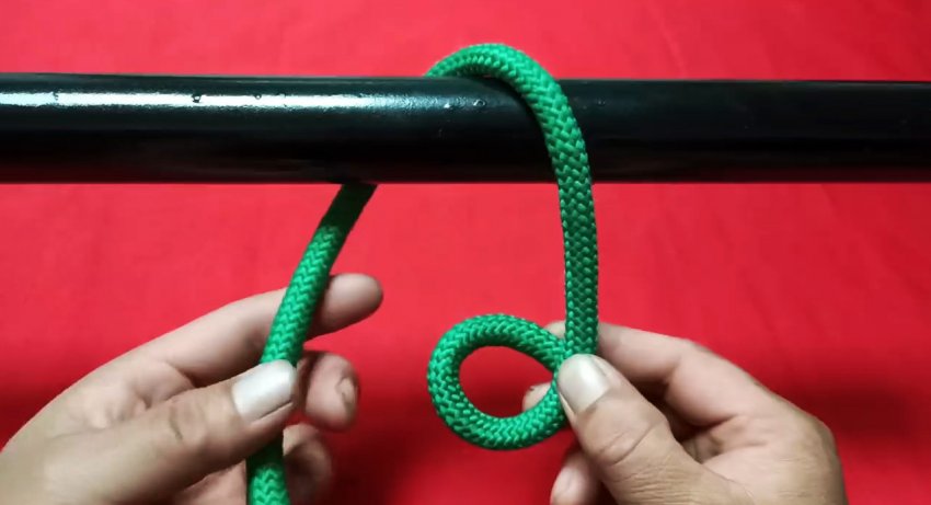 Один край веревки складывается пополам. На образовавшейся петле нужно сделать полный оборот вторым концом. Затем он протягивается в собственное образованное от оборота кольцо.