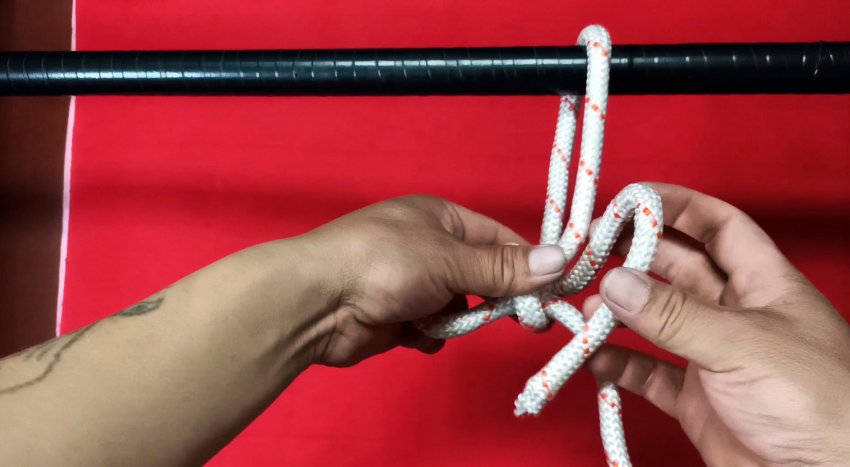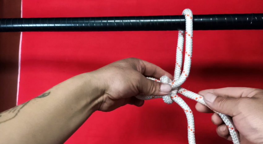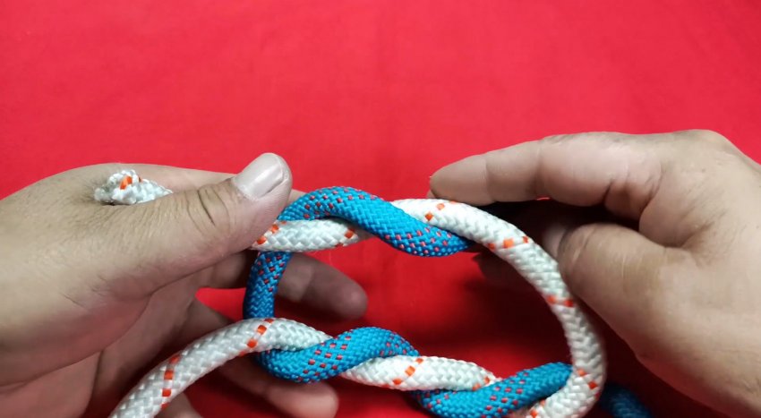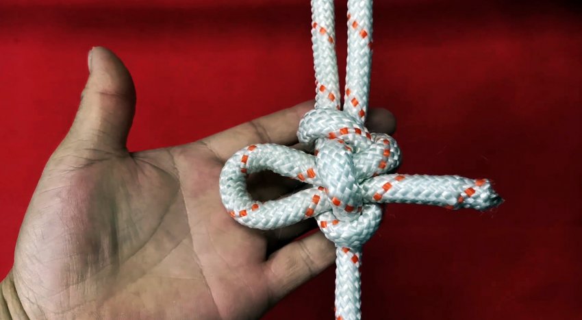 Края веревок складываются вдвое. Одна петля вводится в другую. Короткий край от внутренней веревки пропускается через собственное кольцо.