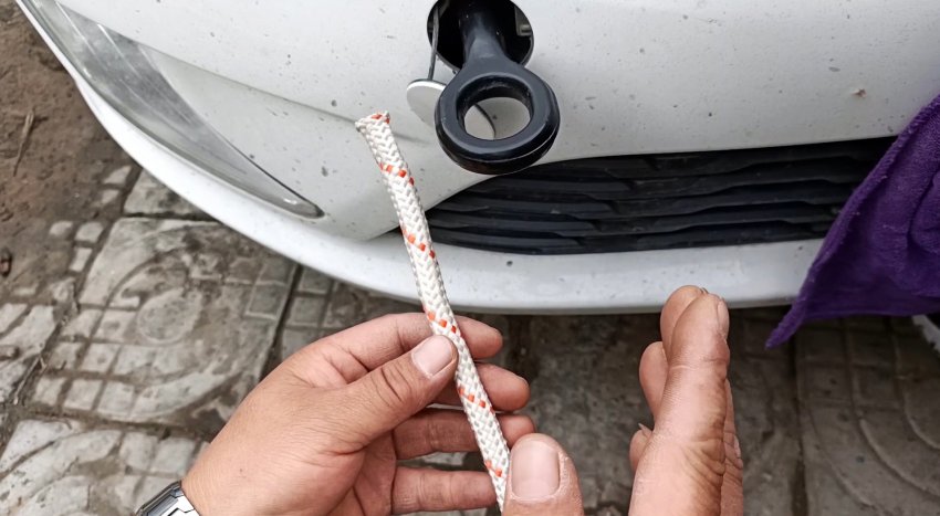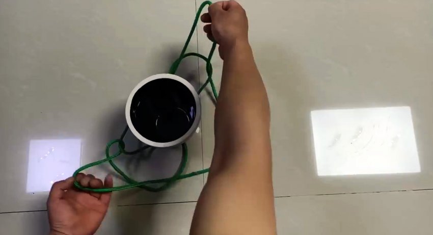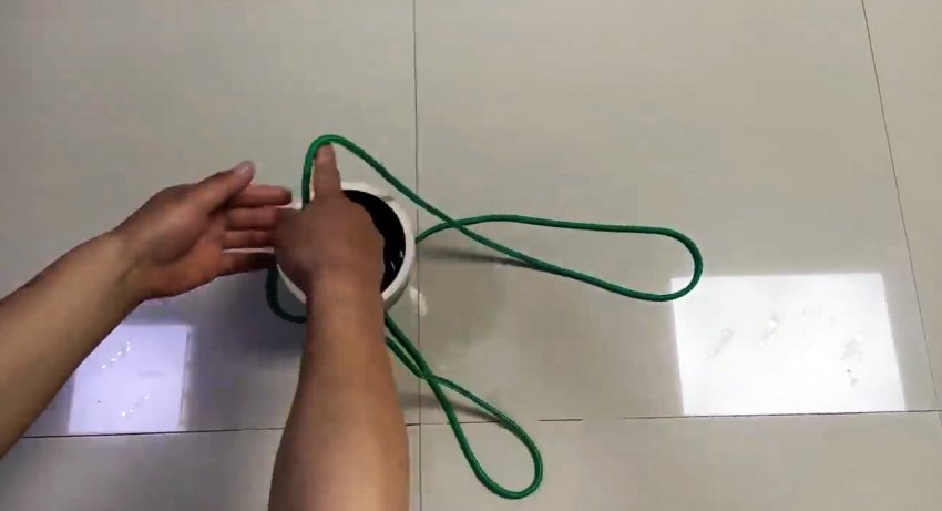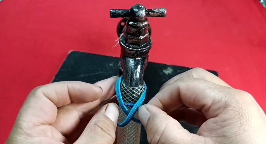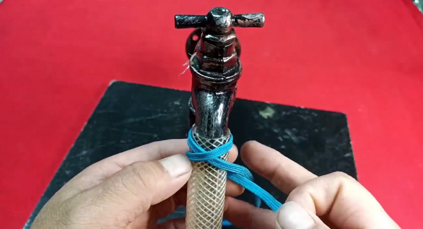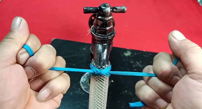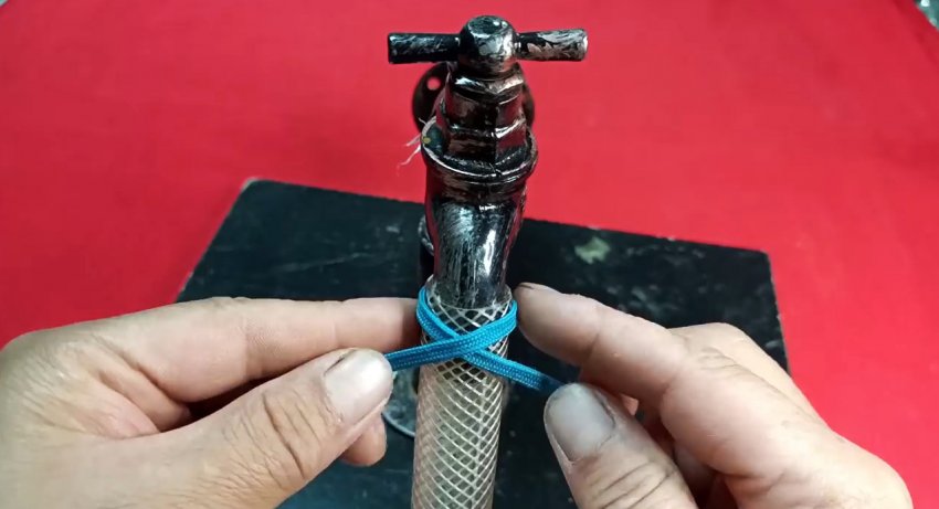 Если нужно затянуть шланг на штуцере или смесителе, то необходимо обернуть вокруг него тонкий шнурок. Затем один край обводится за шлангом под вторым хвостом шнурка.