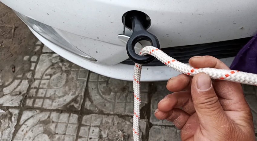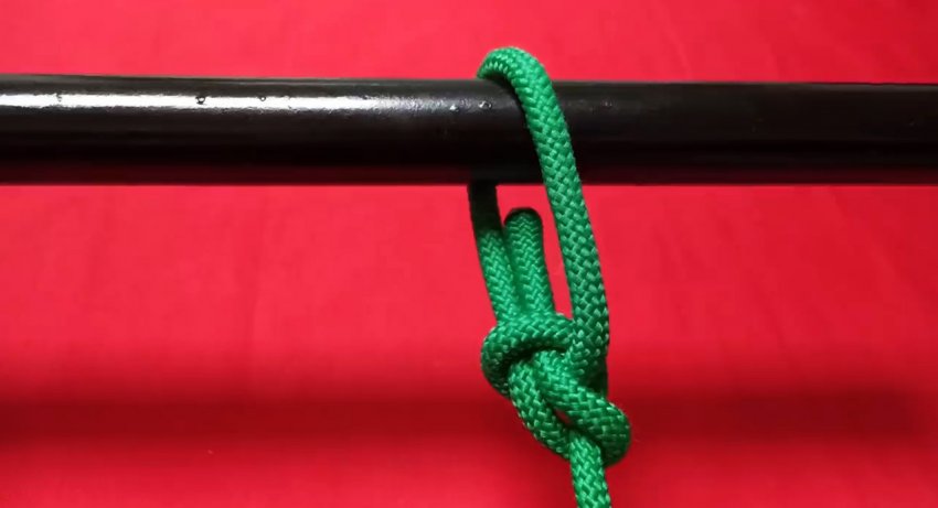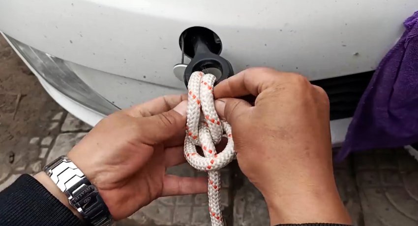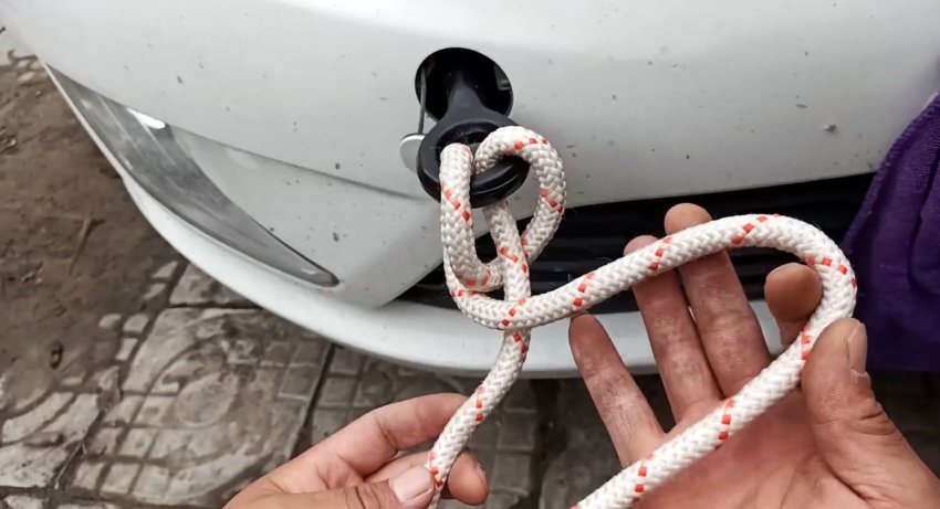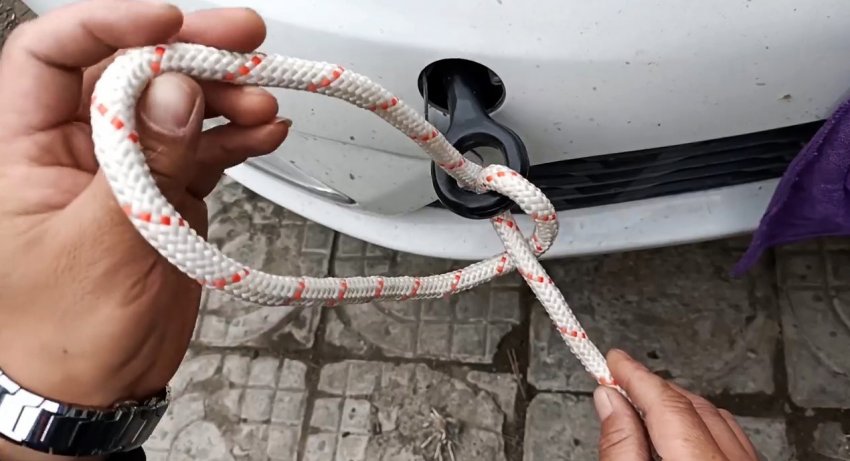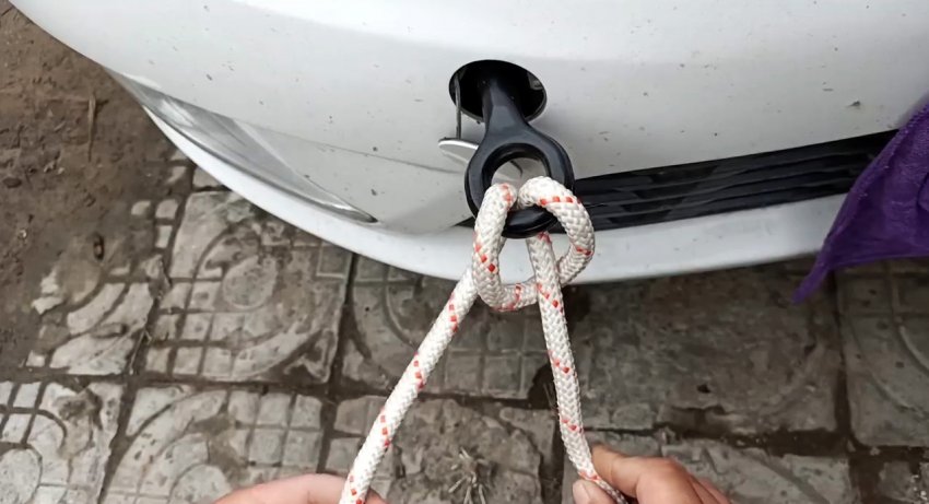 Этот узел поможет, когда будет выполняться сильное натяжение, к примеру, при буксировке. Веревка запускается в проушину или перекладину снизу. Затем короткий край обводится за длинный, и вводится снова, но уже сверху.