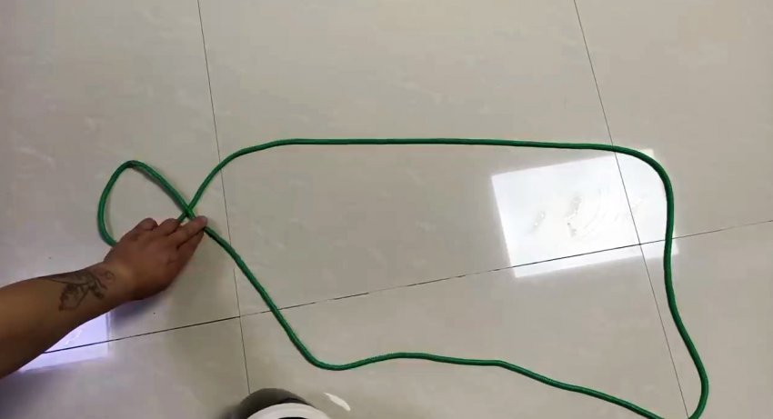 Края веревки складываются накрест. Одна из них оборачивается вокруг второй вдоль в сторону длинного края. Затем аналогично делается со второй веревкой.