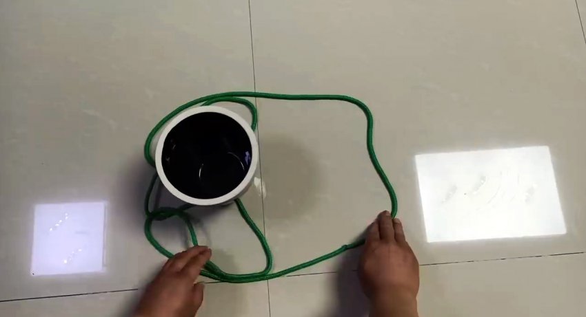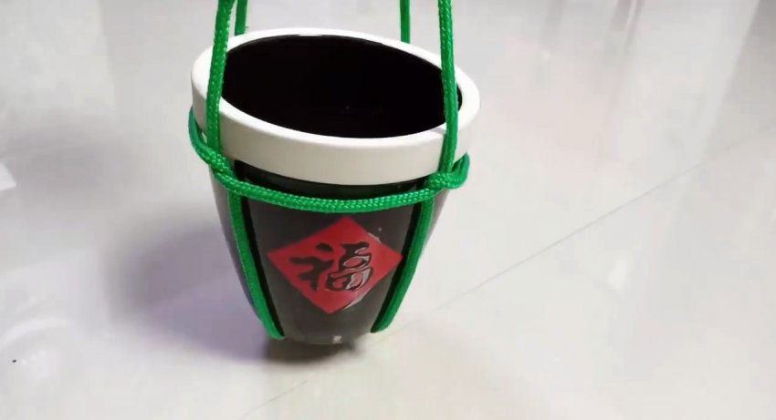 Центральная петля перекидывается через горшок и меньшие петли. Ее нужно подвести под них. Затем остается захватить ее через малые петли и потянуть вверх. В результате веревка охватит горшок и получится 2 ручки.