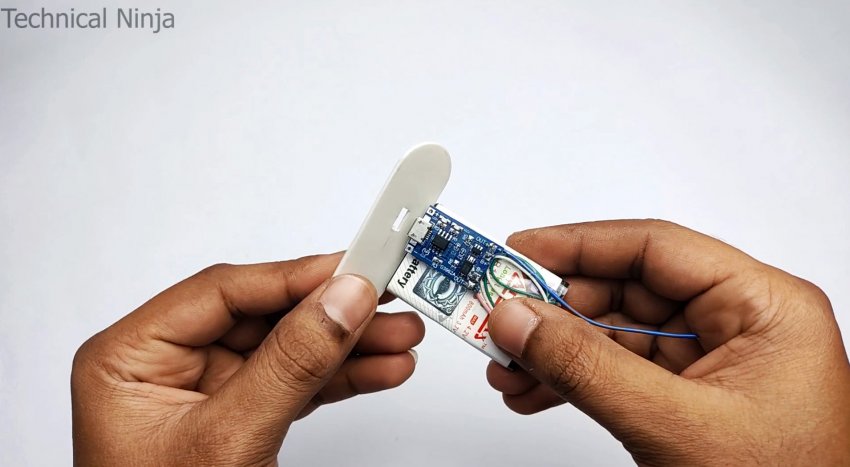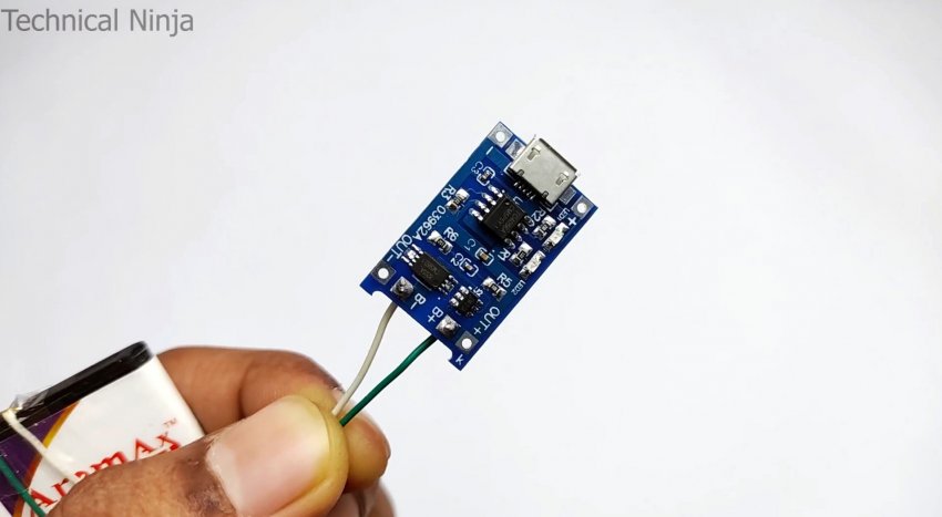 К контактам модуля припаивается 2 провода на выход, и он приклеивается к батарее.