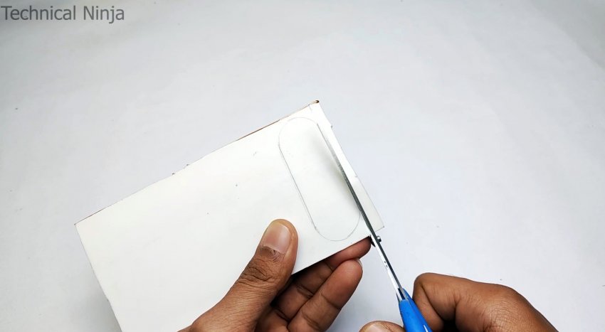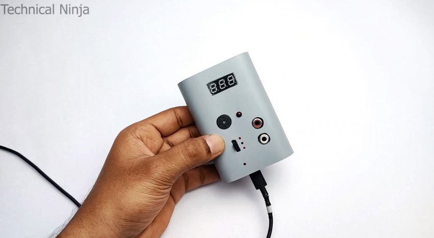 На лицевой стороне корпуса прорезаются окна, требуемые для установки зуммера, светодиода, вольтметра, переключателя, а также 2 гнезд для тюльпанов.