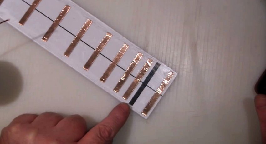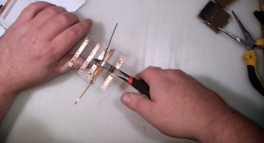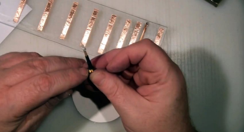 На стекло, ориентируясь по шаблону, приклеиваются полоски самоклеящейся медной ленты. Нужно оставить только вторую полосу шаблона.