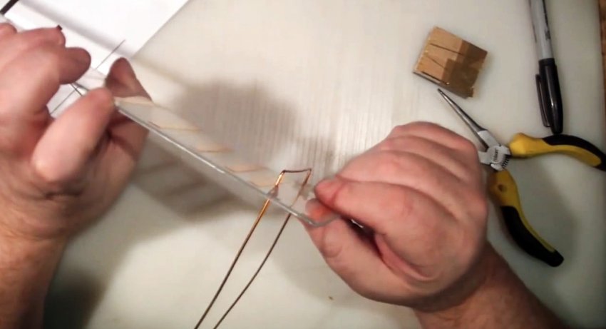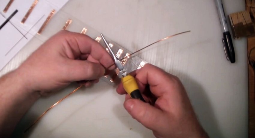 Затем через них пропускается медная проволока. Подкладывая под нее брусок сечением 10 мм нужно выгнуть из нее прямоугольную рамку, выступающую на обе стороны антенны. Края рамки следует обрезать так, что оставит между ними зазор 3 мм.