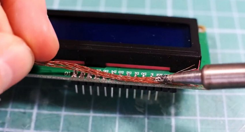 Чтобы быстро выпаять компонент с большим количеством ножек из платы, можно приложить сверху медную оплетку с экранированного провода. Перед этим она смачивается в растворе канифоль, и затем прогревается паяльником.
