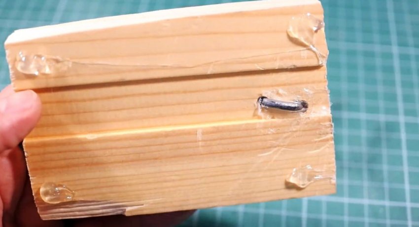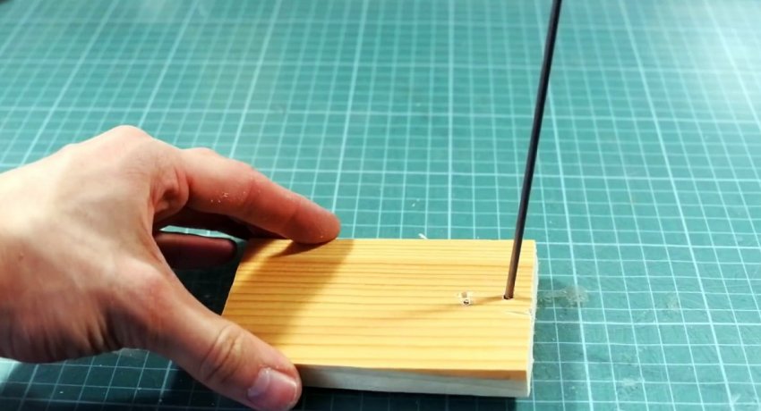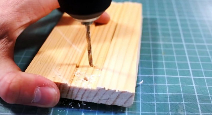 Чтобы сделать подставку, нужно подобрать небольшую дощечку и просверлить в ней под одним краем рядом 2 отверстия.