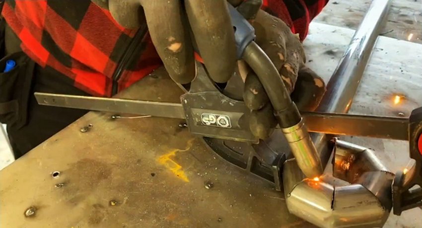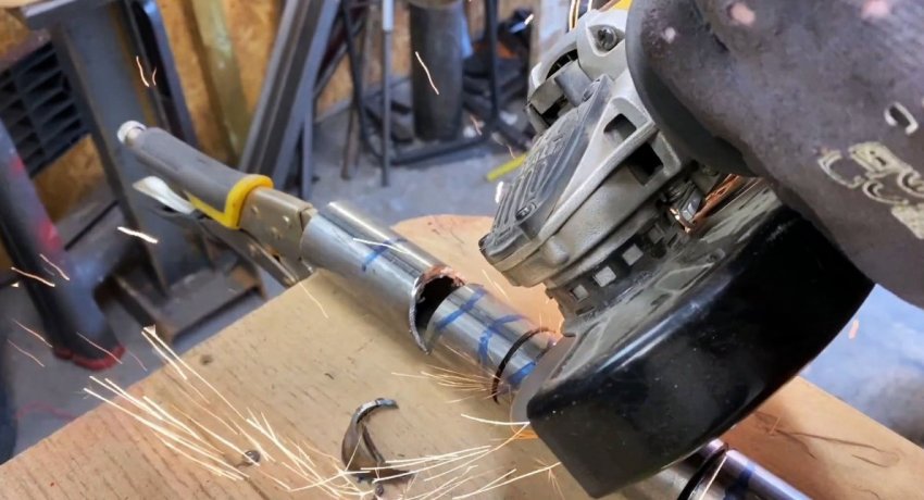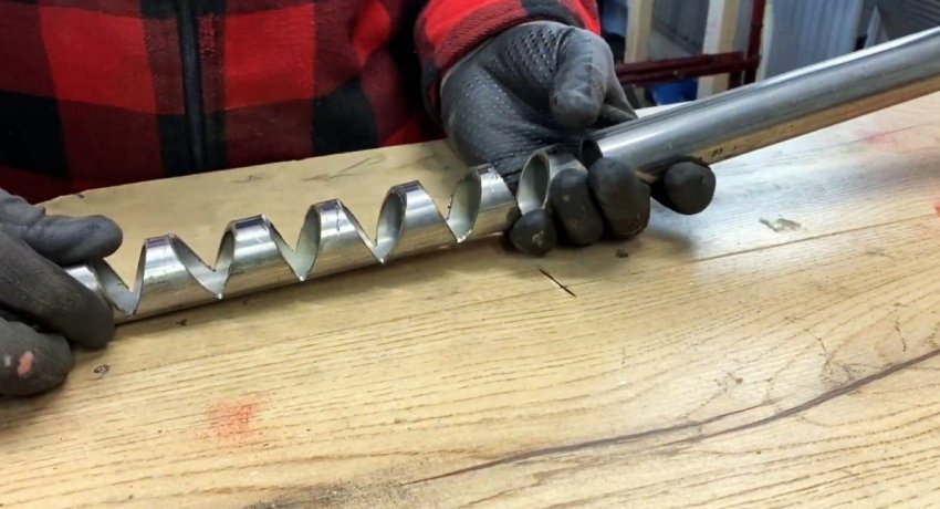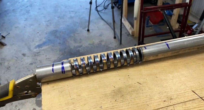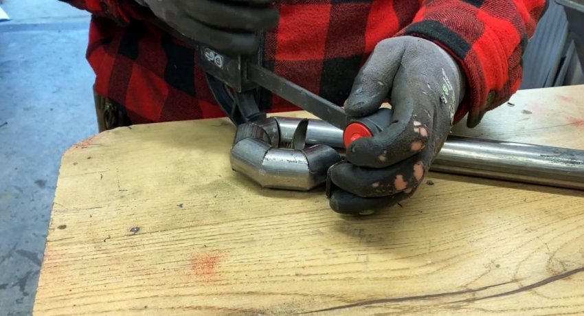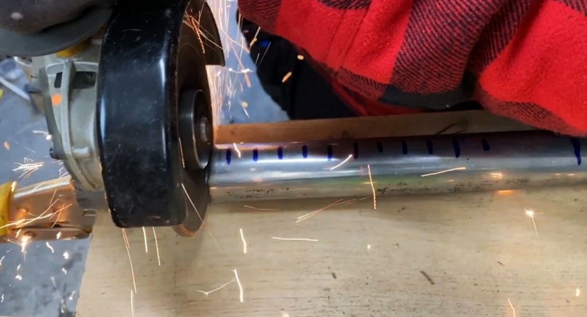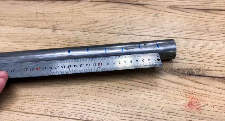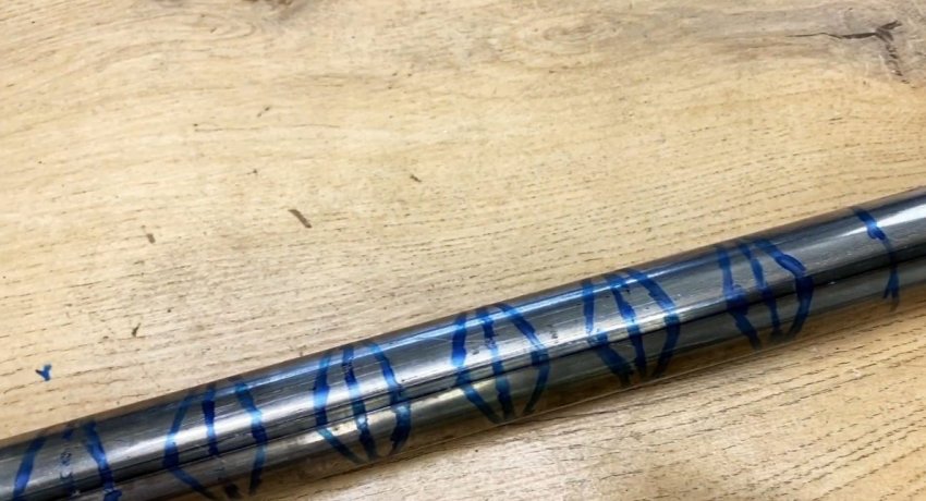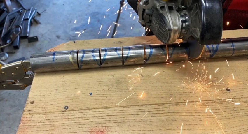 Ее шаг выбирается в зависимости от радиуса изгиба и диаметра самой трубы. По шкале рисуются ромбы, как на фото, и вырезаются болгаркой.