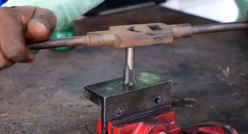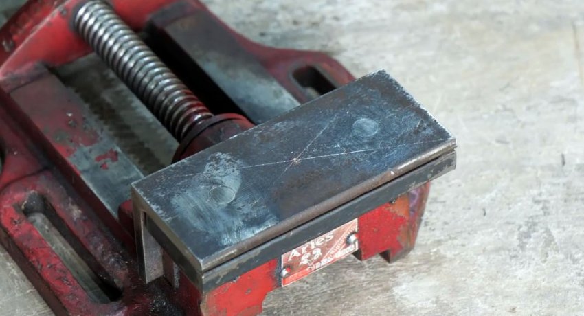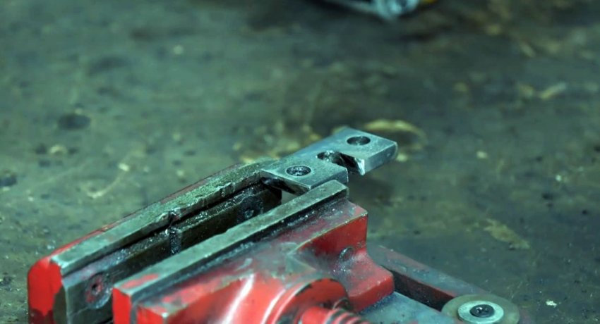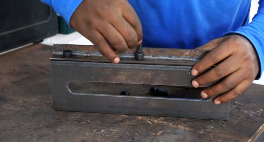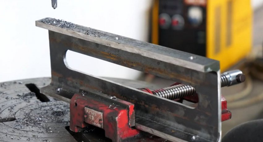 По краям выреза на лицевой части швеллера прикручиваются уголки. Один будет служить неподвижной губкой, второй упором для винта. Последний необходимо усилить, прикрутив к нему толстую полосу. Затем уголок и полоса просверливаются под винт, и в них нарезается резьба.