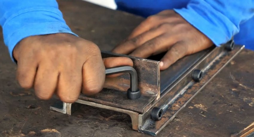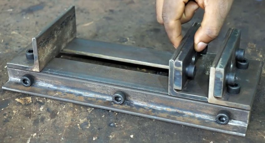 Тот представляет собой 2 полосы металла с парой отверстий под болты. Одна из них это вставка, толщиной равной сечению металла швеллера и шириной соответствующей разрезу в основании. Вставка работает как направляющая скользящей губки. Вторая полоса это широкий ограничитель, удерживающий конструкцию снизу основания.