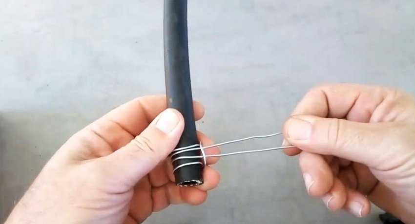 Чтобы сделать хомут, нужно намотать на шланг 2 полные витка проволоки.