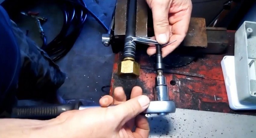 Затем кольцо снимается, от него делается отступ на 2 пальца, и на шланг накручивается еще пара витков.
